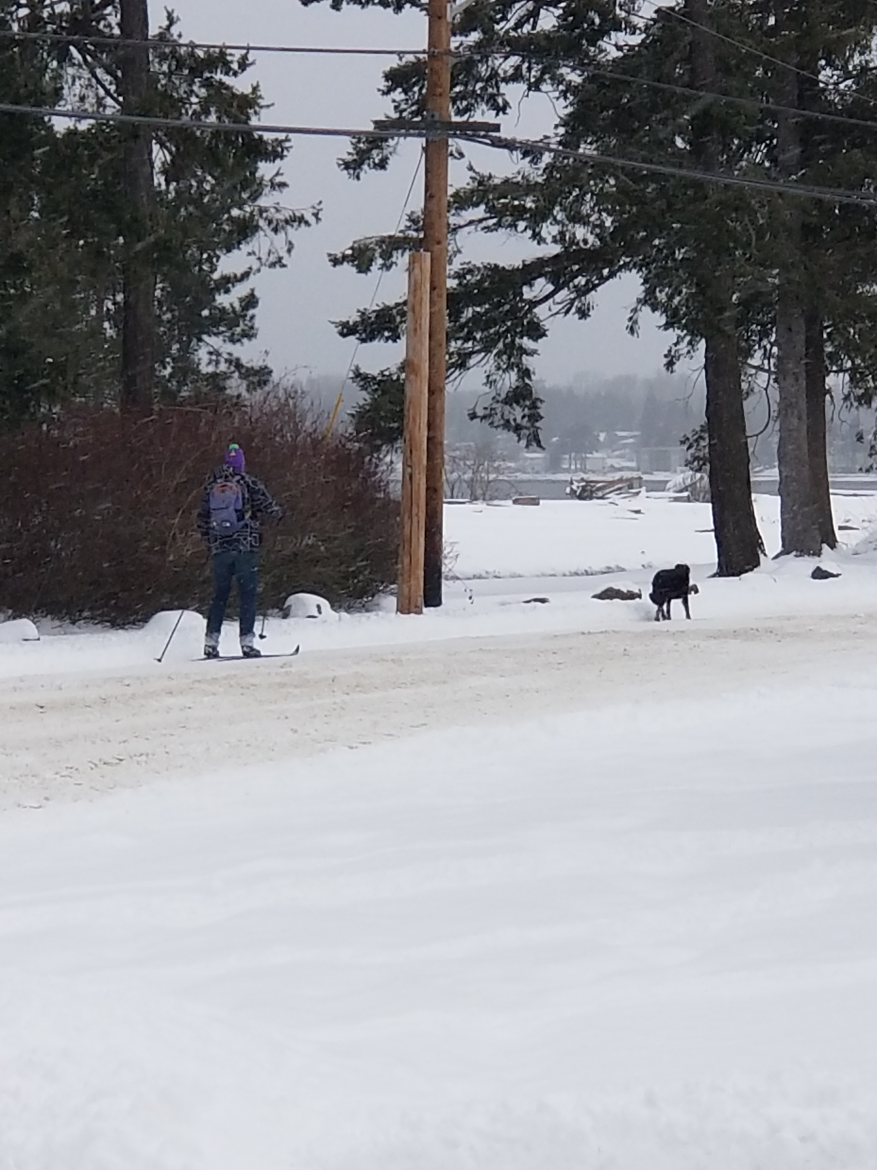 This is what Birch Bay looked like for some of this winter. The Dog you see reminder me of my black dog not called Blacky. The dog was not on a leash. If he got to far ahead of the man on skies the dog would stop and wait.